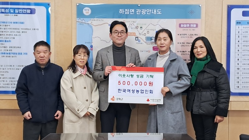이에 이철호 하점면장은 “어려운 경제 여건 속에서도 매년 잊지 않고 소중한 성금을 기탁해 주신 봉천교회와 한국여성농업인 하점면회에 진심으로 감사드린다”며, “보내주신 따뜻한 마음은 도움이 필요한 이웃들에게 잘 전달해 함께 행복한 하점면을 만드는 데 최선을 다하겠다”고 화답했다.