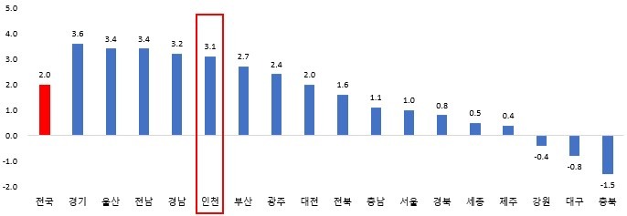 인천시는 최근 3년간(2022~2024년) 연속적인 고성장을 이어가며, 3년 평균 경제성장률 5.3%를 기록해 전국 1위에 올랐다. 이는 전국 평균 성장률 2.1%를 크게 상회하는 수치로, 인천 경제의 성장 잠재력과 경쟁력을 보여주는 결과로 평가된다.