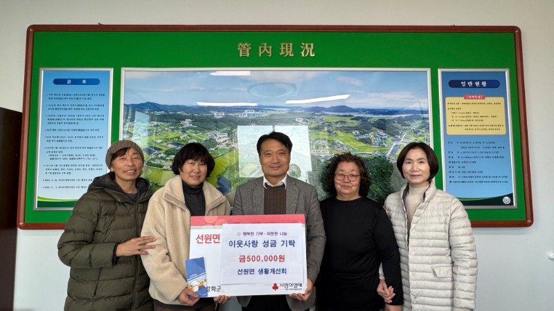 이정실 선원면장은 “연말연시 어려운 이웃을 위해 나눔에 동참해 주셔서 깊이 감사드린다”며, “전달받은 성금은 취약계층을 위해 투명하고 뜻깊게 사용하겠다”고 감사 인사를 전했다.