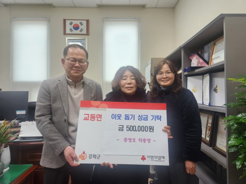 최동관 교동면장은 “지역의 어려운 이웃을 먼저 생각하고 나눔을 실천해 주신 차충영 대표님께 깊은 감사를 전하며, 기탁해 주신 성금은 도움이 필요한 곳에 의미 있게 사용하겠다”고 감사 인사를 전했다.