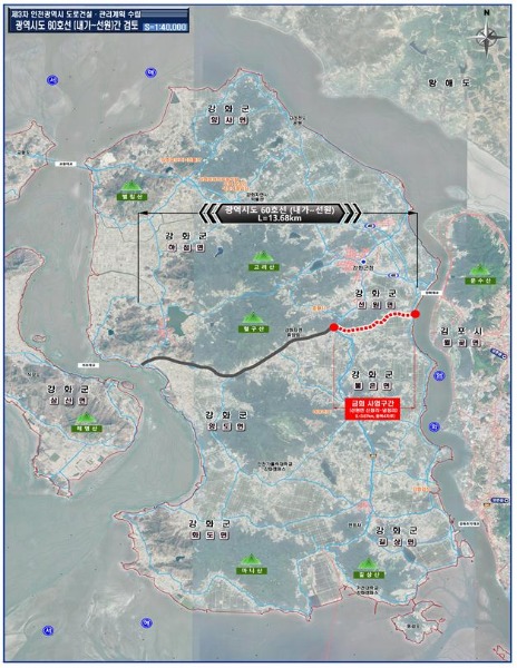 광역시도60호선 도로사업은 계양∼강화 고속도로 종점인 선원면 신정리에서 현재 공사 중인 국지도84호선 종점인 선원면 냉정리를 연결하는 총연장 3.67km, 왕복4차로 규모로 추진된다. 사업이 완료되면 고속도로와 연계한 강화군 내 주요 간선도로망이 서로 연결*되어 접근성이 크게 개선되고 지역 주민과 관광객의 교통 편의도 한층 높아질 것으로 기대된다.