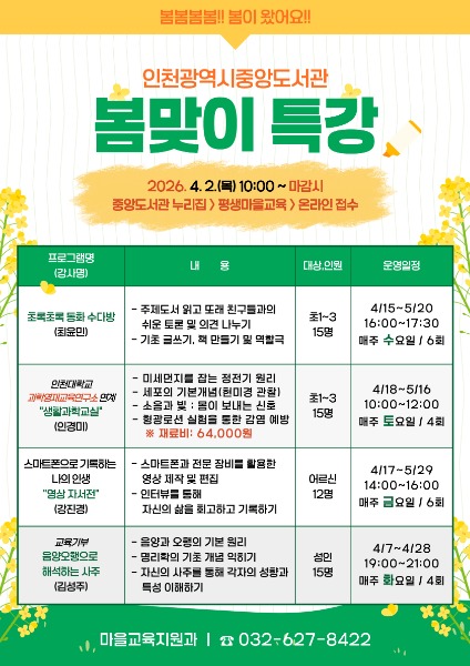 참여 신청은 중앙도서관 누리집에서 4월 2일 오전 10시부터 선착순으로 진행되며, 수강료는 무료(재료비 등 학습자 부담)이다. 자세한 사항은 도서관 누리집을 확인하거나 마을교육지원과(☎032-627-8422)로 문의하면 된다.