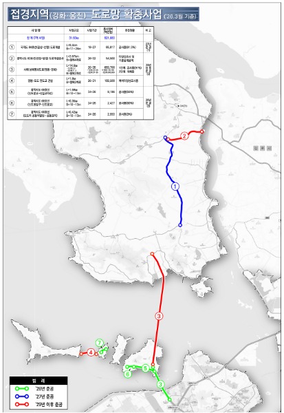 둘째, 강화·옹진에서도 변화가 본격화된다. 서해 남북평화도로와 국지도84호선(길상~선원) 등 총 7개 사업이 추진되며, 총연장 31.93km, 사업비는 약 9,217억 원 규모다.