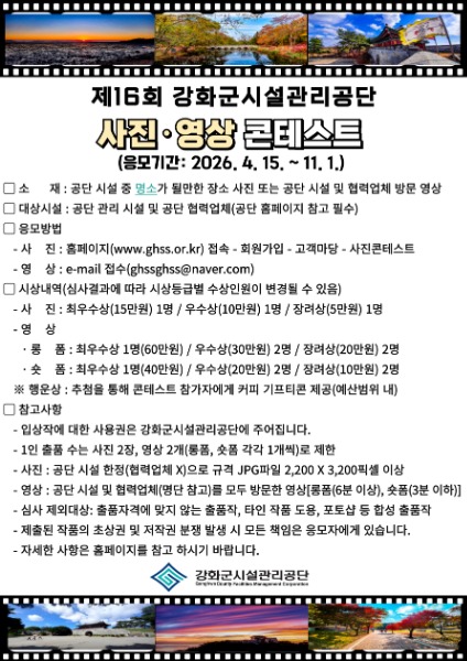 강화군시설관리공단(이사장 박영길)이 ‘제16회 강화군시설관리공단 사진·영상 콘테스트’를 개최한다.