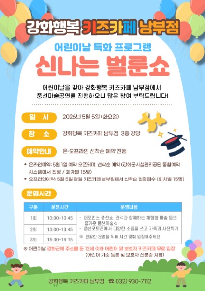 강화행복 키즈카페 남부점, 어린이날 벌룬쇼 진행 최벽하 기자 발행 2026-04-21 12:13 Facebook Twitter band 네이버블로그 카카오스토리 카카오톡 글자작게 글자크게 5월 5일 방문객이라면 누구나 무료 체험 <저작권자 ⓒ 강화투데이, 무단 전재 및 재배포 금지> 최벽하 기자 다른기사보기